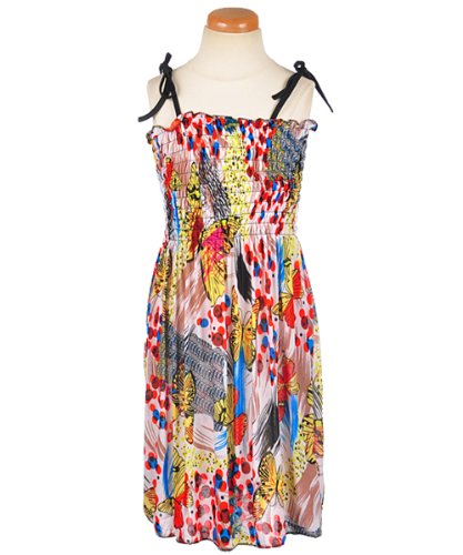 You will love the bold and airy style of the dress romantic Sini. Made from a cool cotton blend, it features a ruched bodice and an elastic strap tie. Bright colors and fun butterfly print summer flair. 95% Polyester, 5% Spandex Machine wash cold Made in China